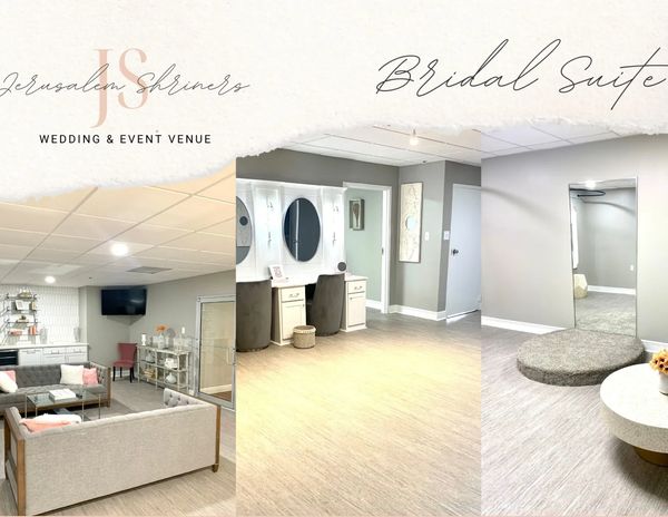 ❖ The Bridal Suite is an exclusive, spacious upstairs suite that overlooks the ballroom. The suite includes a wet bar, mini fridge, 2 luxury couches, 1 smart tv with streaming services, luxury vanity that seats 3 guests to get their hair/makeup done, a separate spacious changing room, and a private restroom with marble shower. No need to get dressed anywhere else, we have it all!