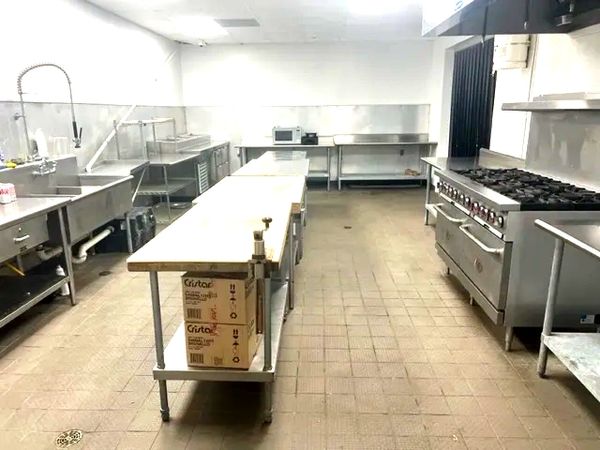 Our kitchen has an industrial gas stove, multiple prep counters, mobile steam table that holds 5 chafer dishes , mobile industrial warmer that holds up to 7 racks, industrial ice machine, industrial fridge, industrial freezer, kitchen equipment. The catering staff of your choice will love what we have to offer!